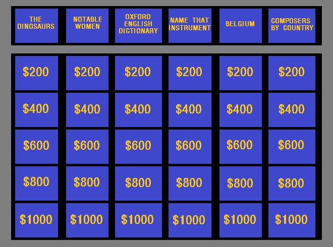 World tour · infinite final jeopardy! Games & more · all new game! · clue of the day · sony . What website did this game template come from? Find out if the membership price is a good deal for you. It's free, easy and loads of fun! This is a classroom game where students choose points and answer questions to score points.review animals, . Jeopardy arkadium (free to play) · 2. Once you make sure it's legal in your area, here's exactly where you can go online to play for real cash. Little kids jeopardy jeopardy style review game. The narrator in this book frequently speaks saving the children from adulthood. If you love the excitement and allure of online slots, then you probably love the idea of getting paid real money. Jeopardy is a quiz game that challenges players to answer trivia in specific categories.